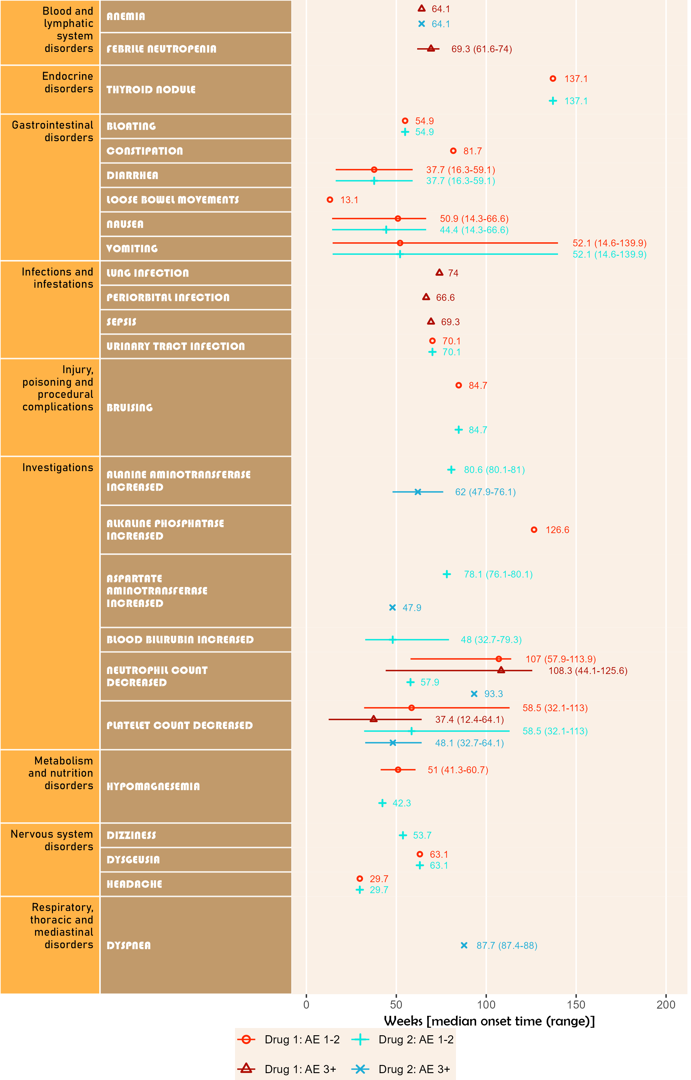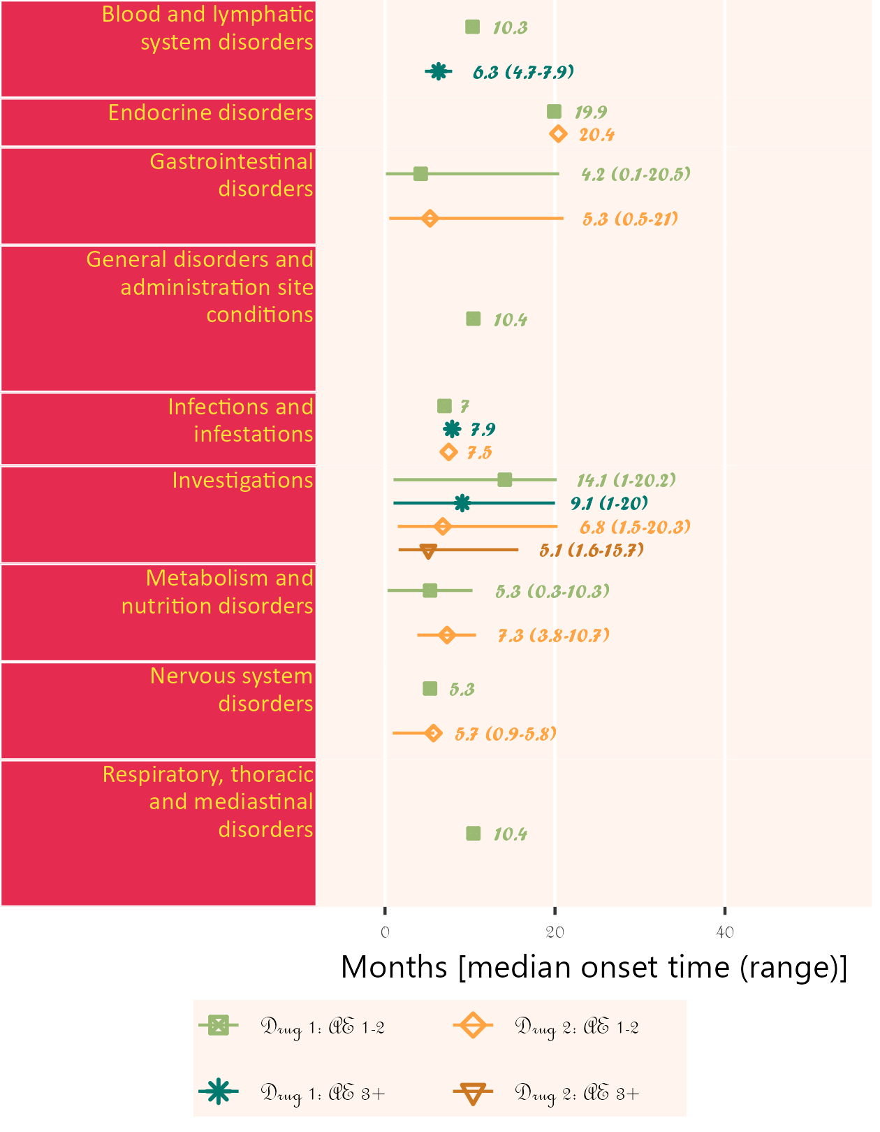 The next plot summarizes timeline by AE category. Fonts, colours, symbols, column widths (character length) and time unit are customized.