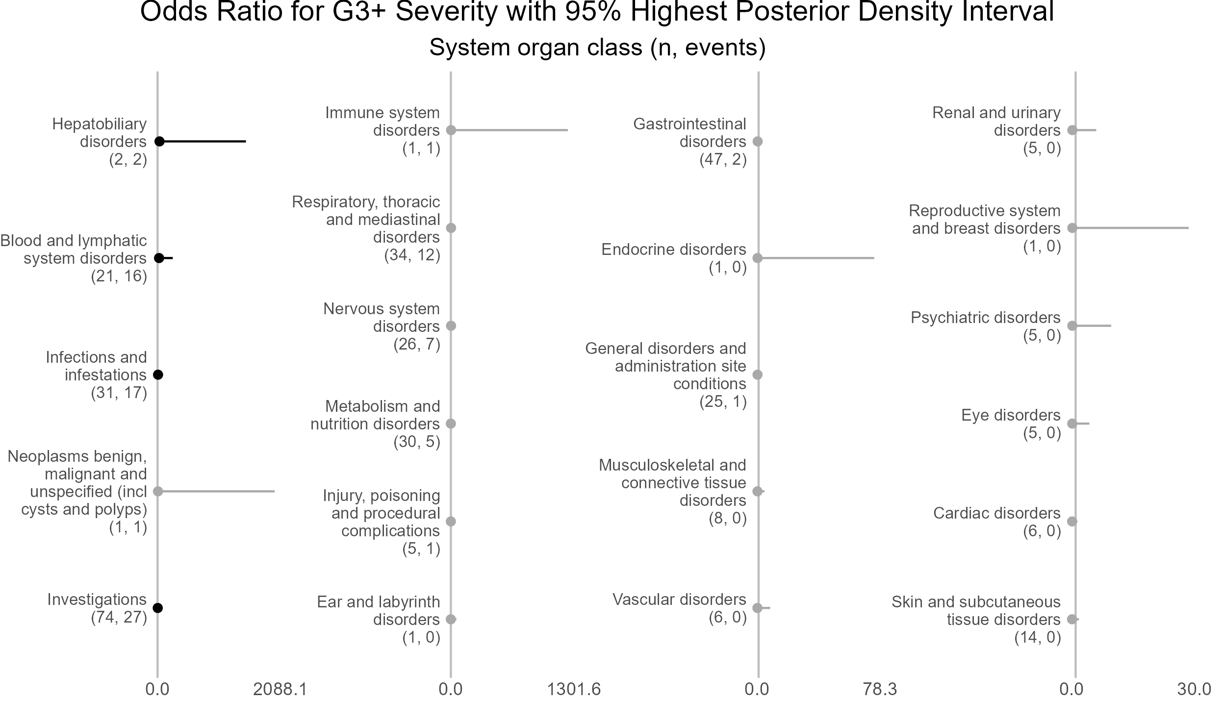 title = "Odds Ratio for G3+ Severity with 95% Highest Posterior Density Interval",