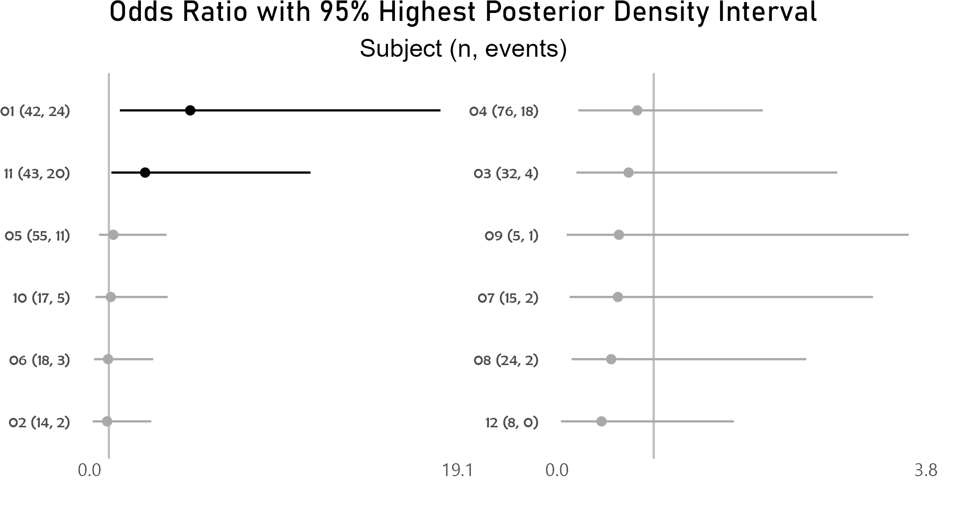 After controlling for first and second drug attributions, subject 01 has a higher odds for grade 3 or higher adverse event than the average of study participants.