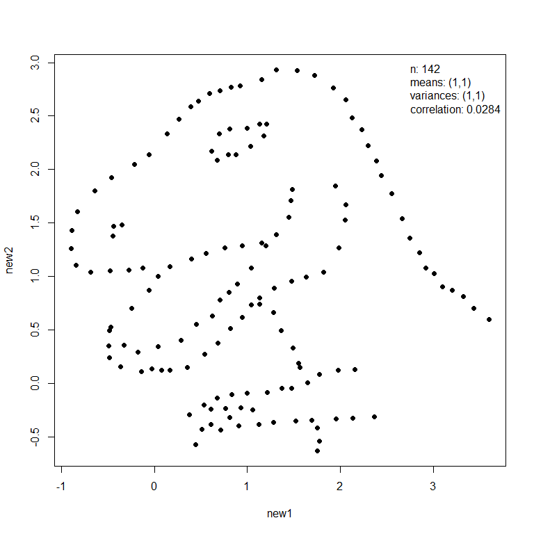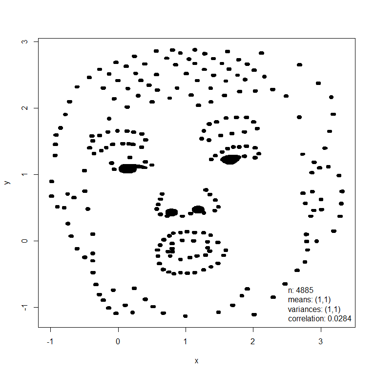 The rotation applied to the input dataset is not unique. The function mimic (and a function anscombise that is specific to Anscombe’s quartet) has an argument idempotent that controls how the rotation is performed. In the special case where the input dataset already has the desired summary statistics, using idempotent = TRUE ensures that the output dataset is the same as the input dataset.