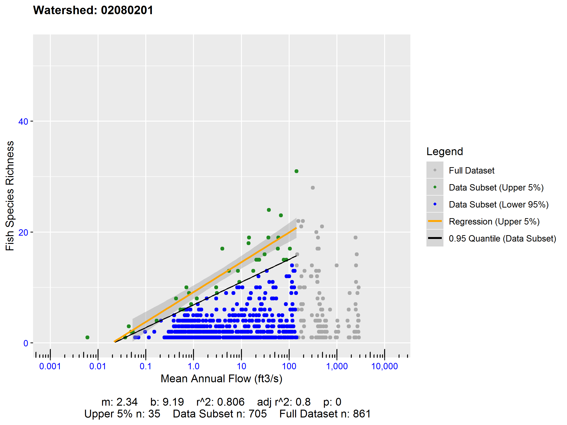 elfgen is an instream flow framework for rapid generation and optimization of flow-ecology relations. The elfgen framework centers on the generation of Ecological Limit Function models (ELFs) describing the relation between maximum species richness and stream size characteristic (streamflow or drainage area). The elfgen framework was developed (By DEQ in cooperation with USGS and Virginia Tech) in response to a need for better environmental flow metrics for assessment of potential impacts of water use. For the first time this new framework may allow quantification of potential species loss resulting from flow change, and may offer an improved understanding of aquatic life risk variability due to geographic location, stream size and local scale.