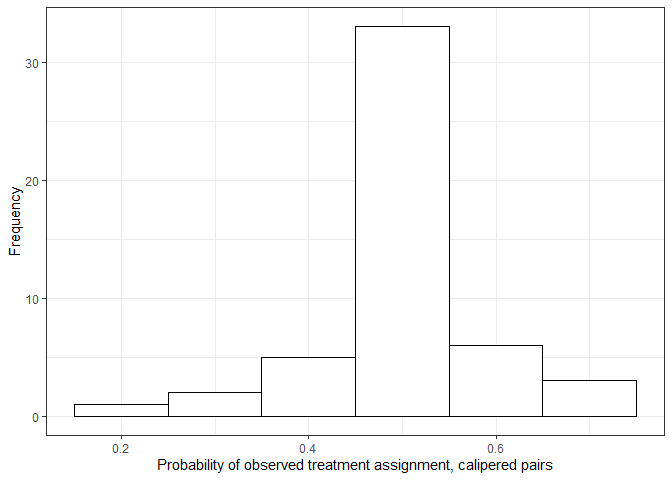 pairs_caliper <- nbp.caliper(treatment, covariates, pmat, xi = 0.1, M = 10000)