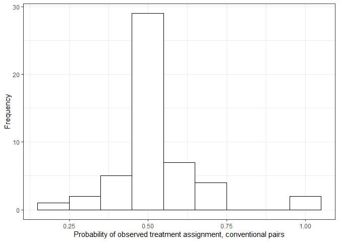 Matched pairs formed without using the dose assignment discrepancy caliper may have probabilities of observed treatment assignment heavily deviate from \(0.5\), as shown in the plot below.