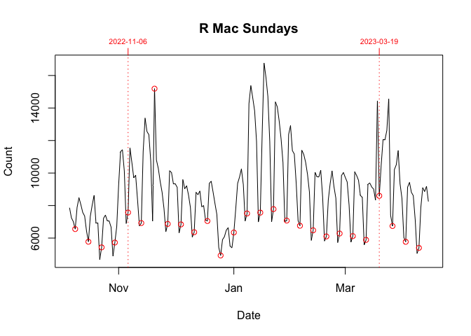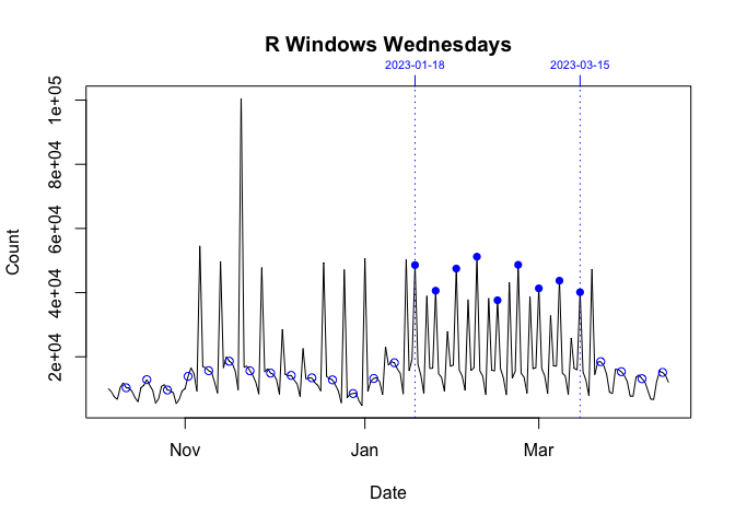Between 06 November 2022 and 19 March 2023, this pattern was broken. On Sundays (06 November 2022 - 19 March 2023) and Wednesdays (18 January 2023 - 15 March 2023), there were noticeable, repeated orders-of-magnitude spikes in the daily downloads of the Windows version of R.