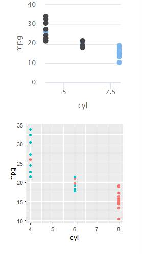 outputggplot(mtcars, aes(x = cyl, y = mpg, color = factor(gear))) +